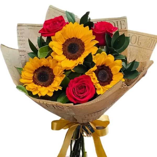 BUQUÊ COM 3 GIRASSOL, 3 ROSAS, EMBALAGENS E LAÇO DE CETIM
