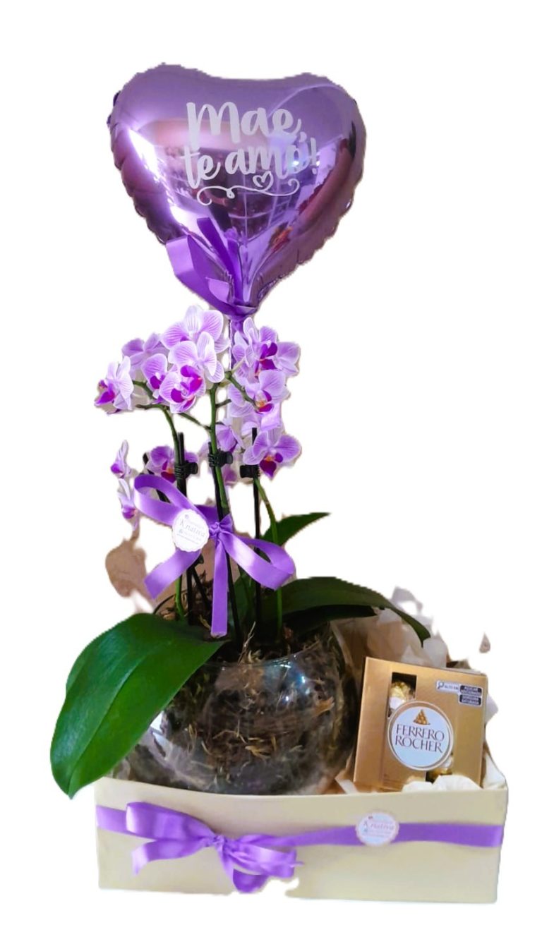 Cesta especial com um vaso de orquideas 60 cm altura ,1 caixinha de bombons ao leite com dizeres de feliz dia das mães,1 caixinha de biscoitos finos em uma caixinha personalizada com dizer para mãe, embalagens e laço de cetim .