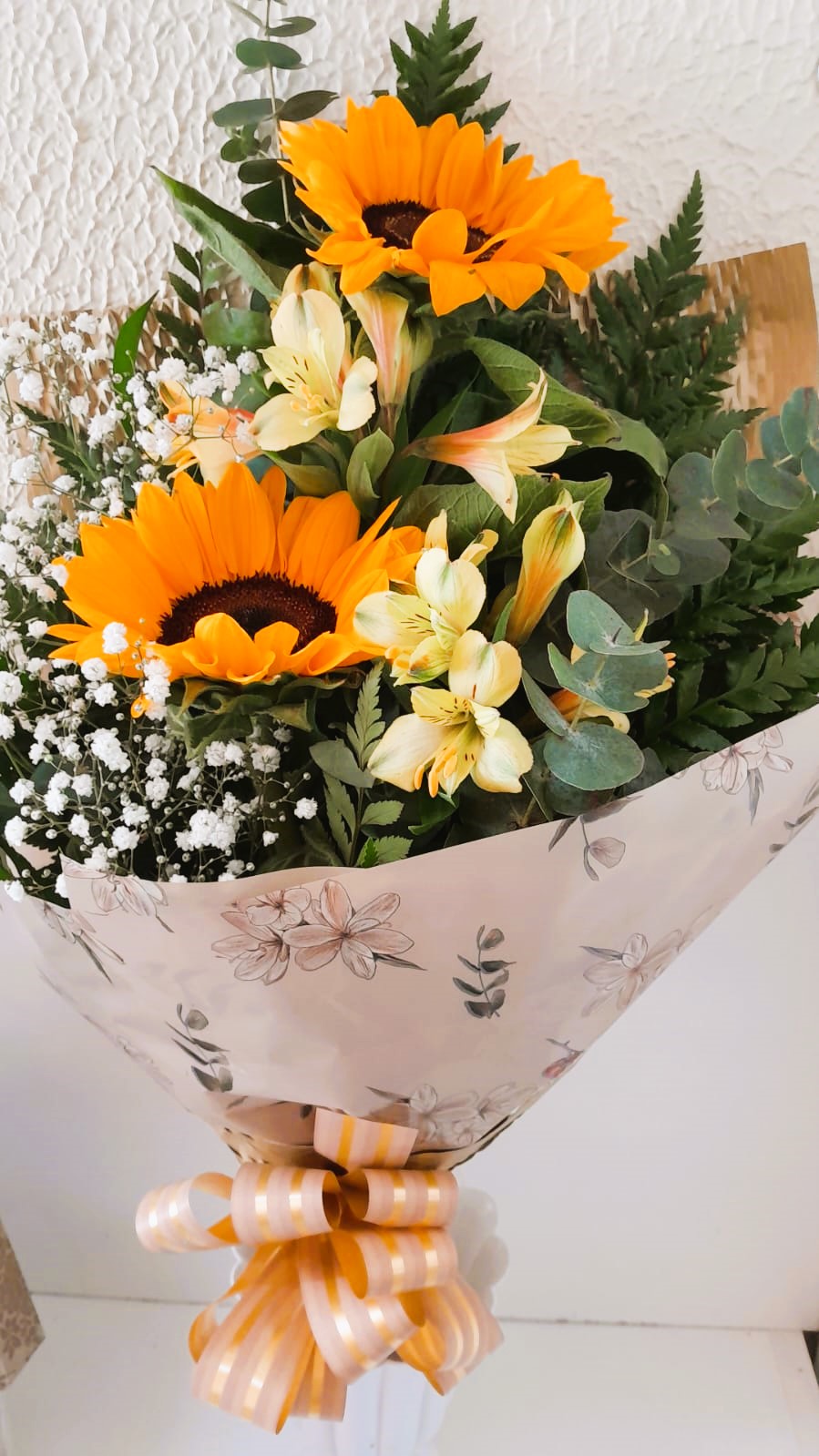 Buquê com 2 girassóis, astromélias, tango, verdes da estação e embalagem especial!