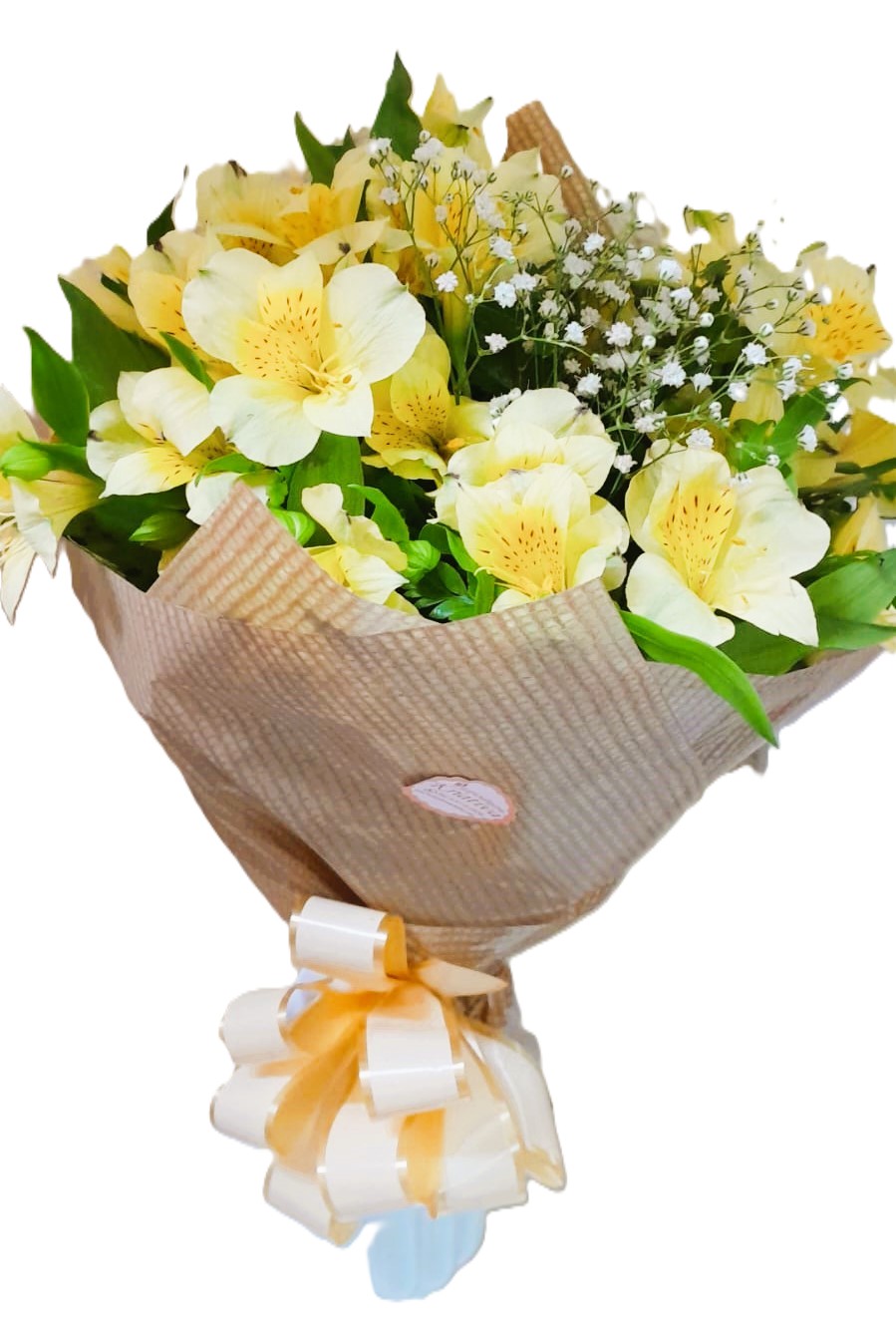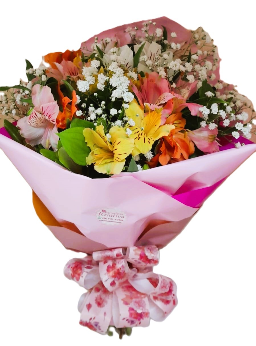 Buquê tamanho média 25 cm diâmetro,com astromélias coloridas ,verdes da estação e mosquitinhos