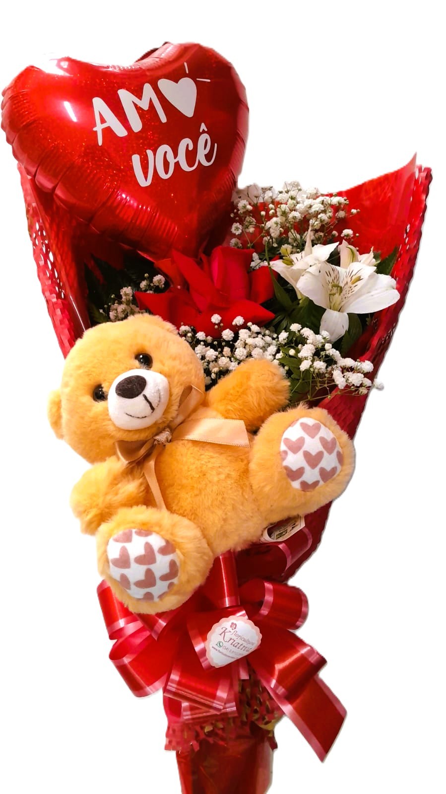 Buquê com 1 rosa vermelha ,verdes e mosquitinhos com embalagens ,1 urso,1 balão com dizeres de aniversário , amor ou amizade!