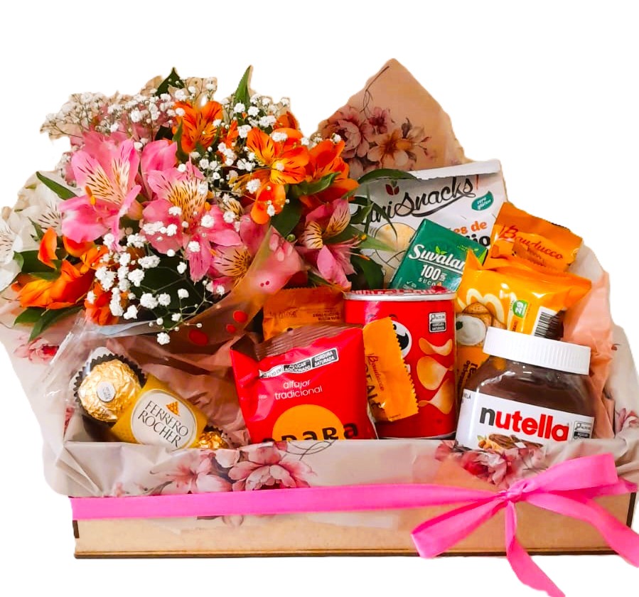 Cestinha de lanche com 1 arranjo de flores coloridas,1 Nutella 140 gr, 2 torradas bauducco,1 alfajor, 1 suco de frutas 200 ml, 1 embalagem de Ferrero rocher com 3 bombons, 1 batata Pringles, 4 biscoitos bauducco, 2 pão de queijo,1 bolo de pote ou em fatia.